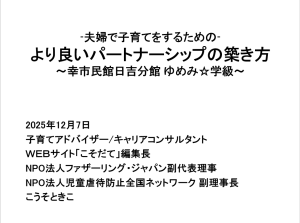 2025年12月7日(日)は、川崎市幸区日吉市民館「夫婦で子育てをするためのより良いパートナーシップの築き方」の講座で、家事育児と夫婦のパートナーシップについてお話ししました。パパチーム、ママチームに分かれてのグループディスカッションも盛り上がりました。